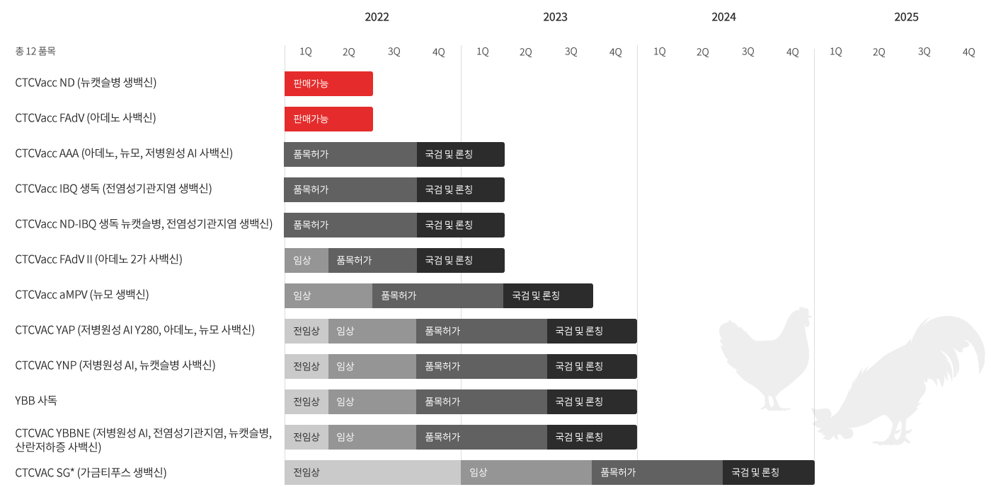 씨티씨백은 양계 분야의 전통적 조합의 합제백신을 비롯하여, 새로운 항원 및 독자적인 항원 조합 등의 트렌드를 반영한 신규 백신 품목의 개발에도 주력하고 있습니다.
